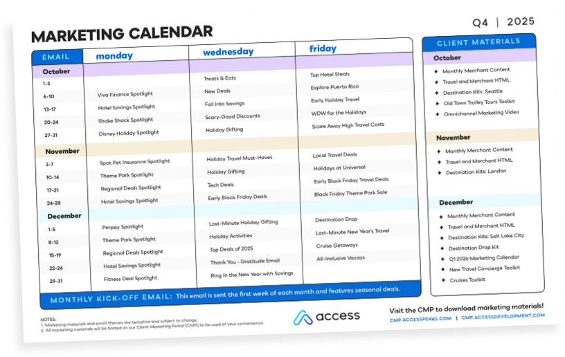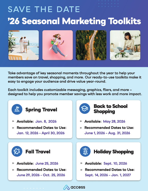 Each toolkit features a specific category, product feature, or merchant from your program. The kit includes web and email banners, social media content, print and digital flyers, marketing copy, and other information to help you promote your program.