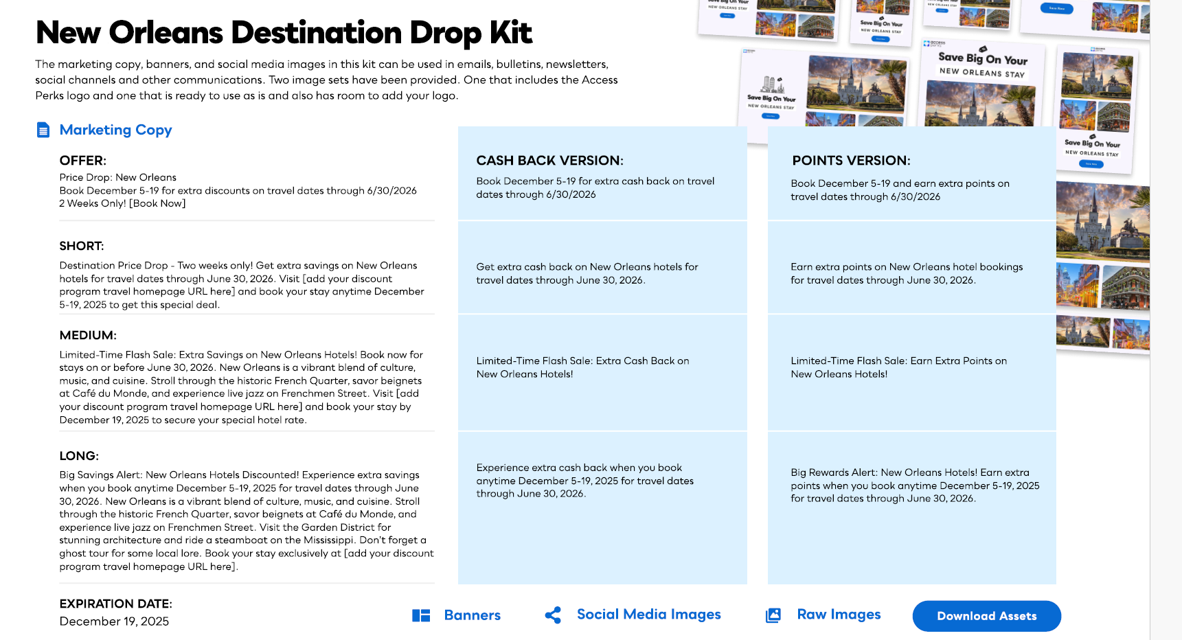 Each toolkit features a specific category, product feature, or merchant from your program. The kit includes web and email banners, social media content, print and digital flyers, marketing copy, and other information to help you promote your program.